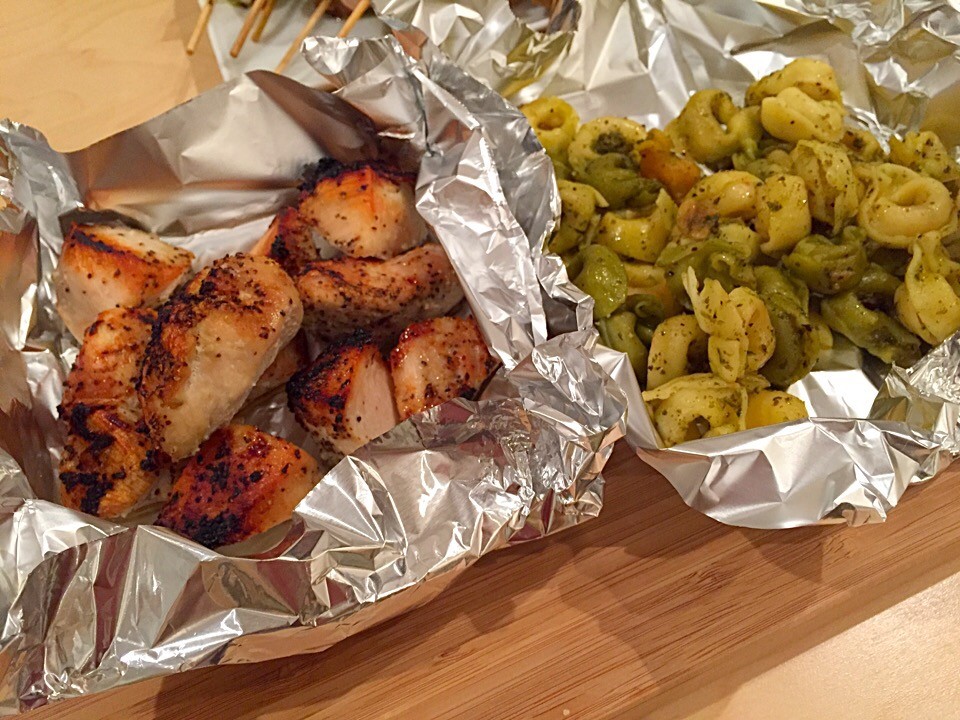 (写真2:チキンのオーブングリル【左】、キノコとバジルのパスタ【右】)